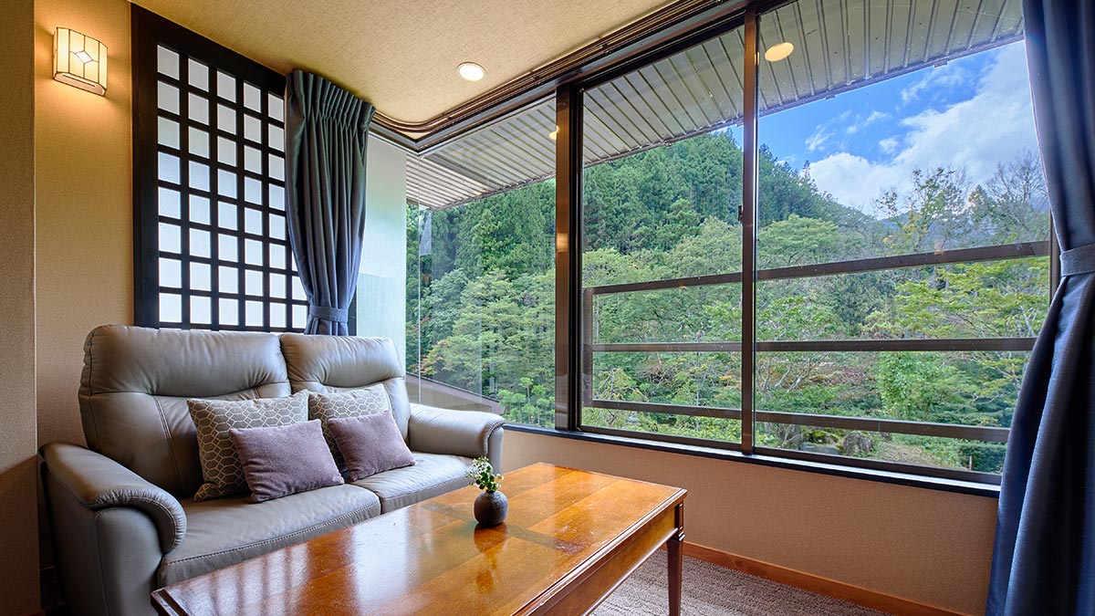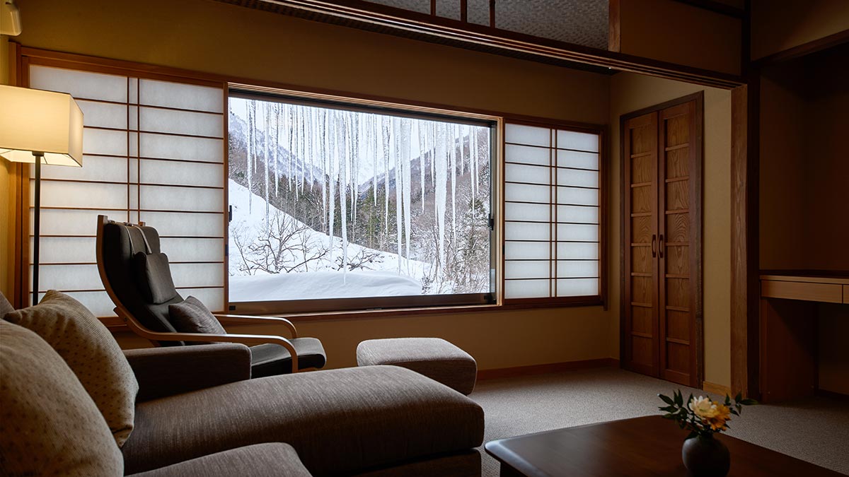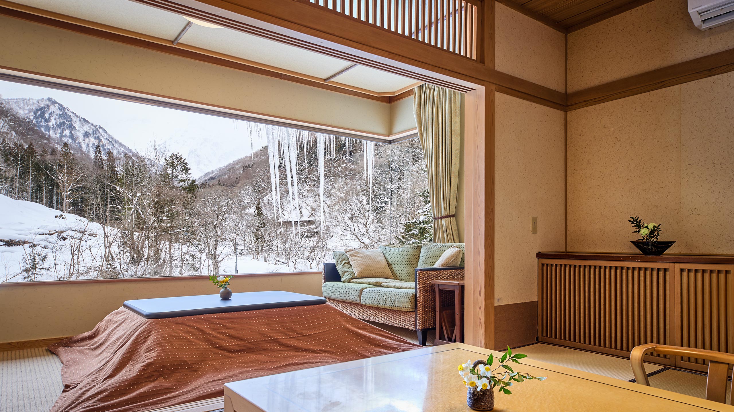 掘りごたつを備えた広縁からは、四季折々に美しく移ろう谷川岳の雄大な景色をお楽しみいただけます。