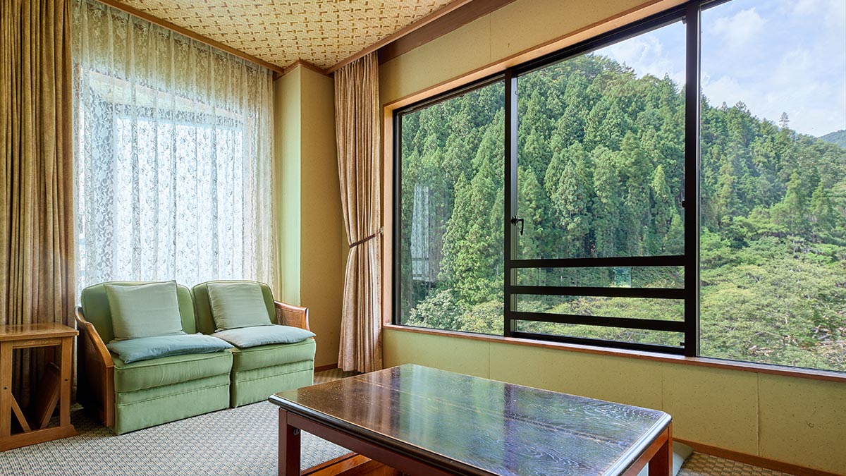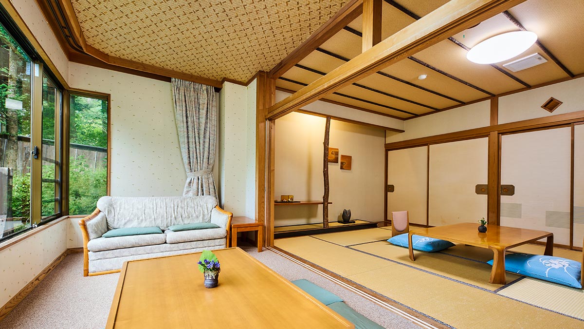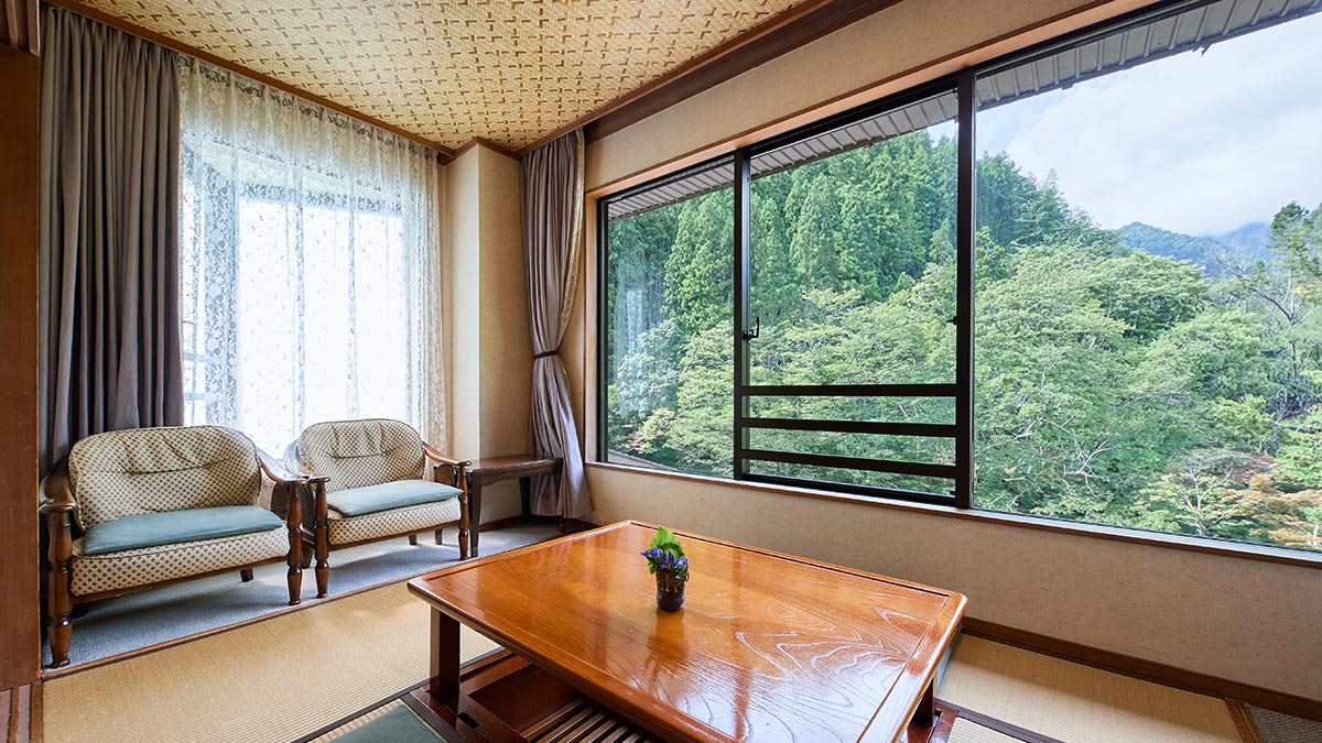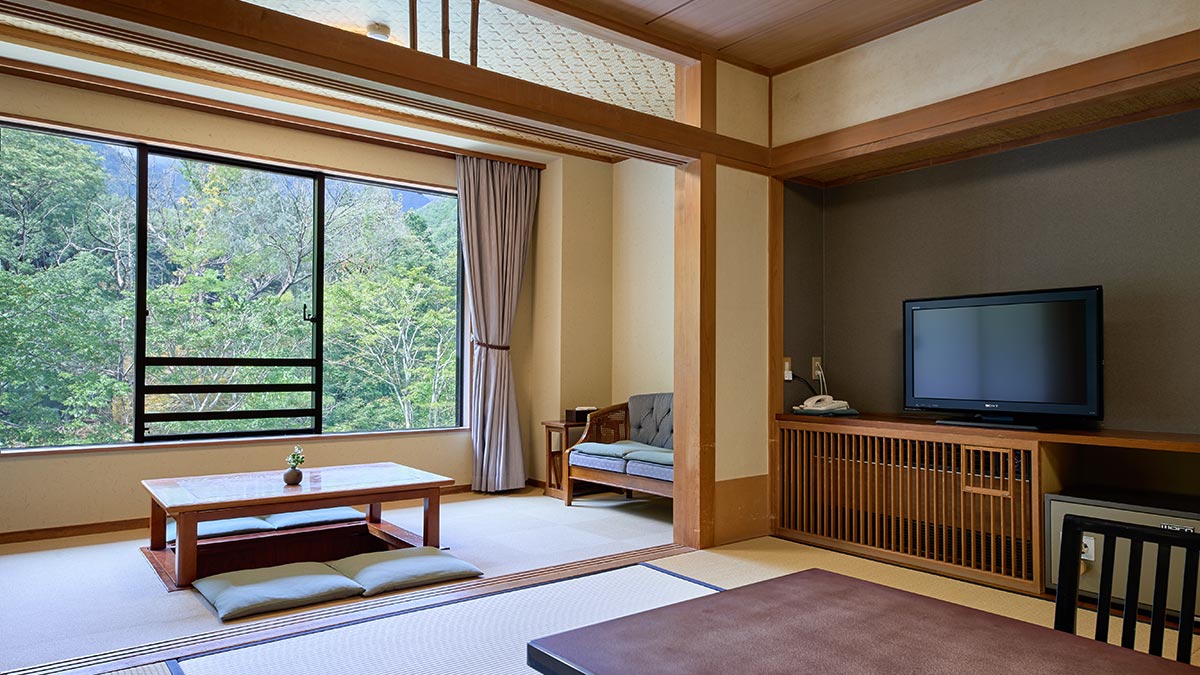 間取り 和室10畳 + 広縁4.5畳 + 半露天風呂 窓の外には、当館の庭と国立公園の雄大な自然が広がります。