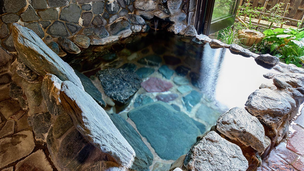 源泉かけ流しの天然温泉を楽しめる半露天風呂には、ジェットバスも完備。