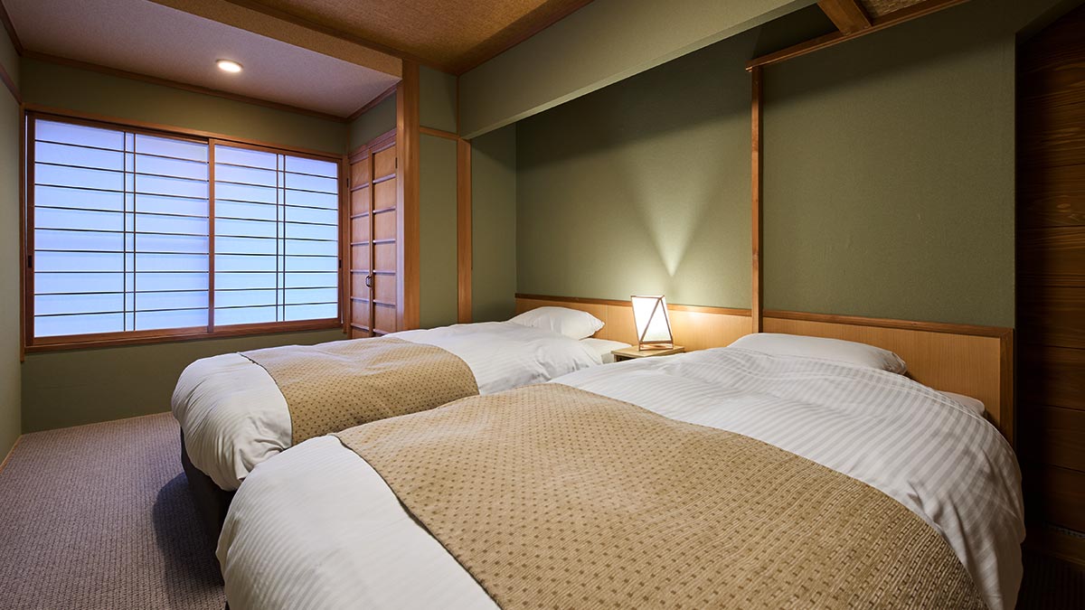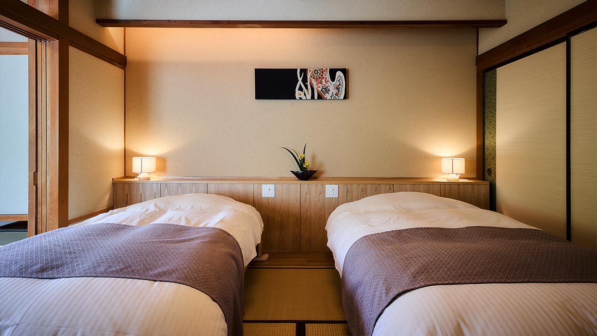 間取り 和室8畳(ツインベッド) + 堀りこたつを備えた広縁3畳 ベッドサイズ 幅100センチ・長さ200センチ・高さ40センチ(2台) 和室には、寝心地にこだわって選んだベッドをご用意しております。