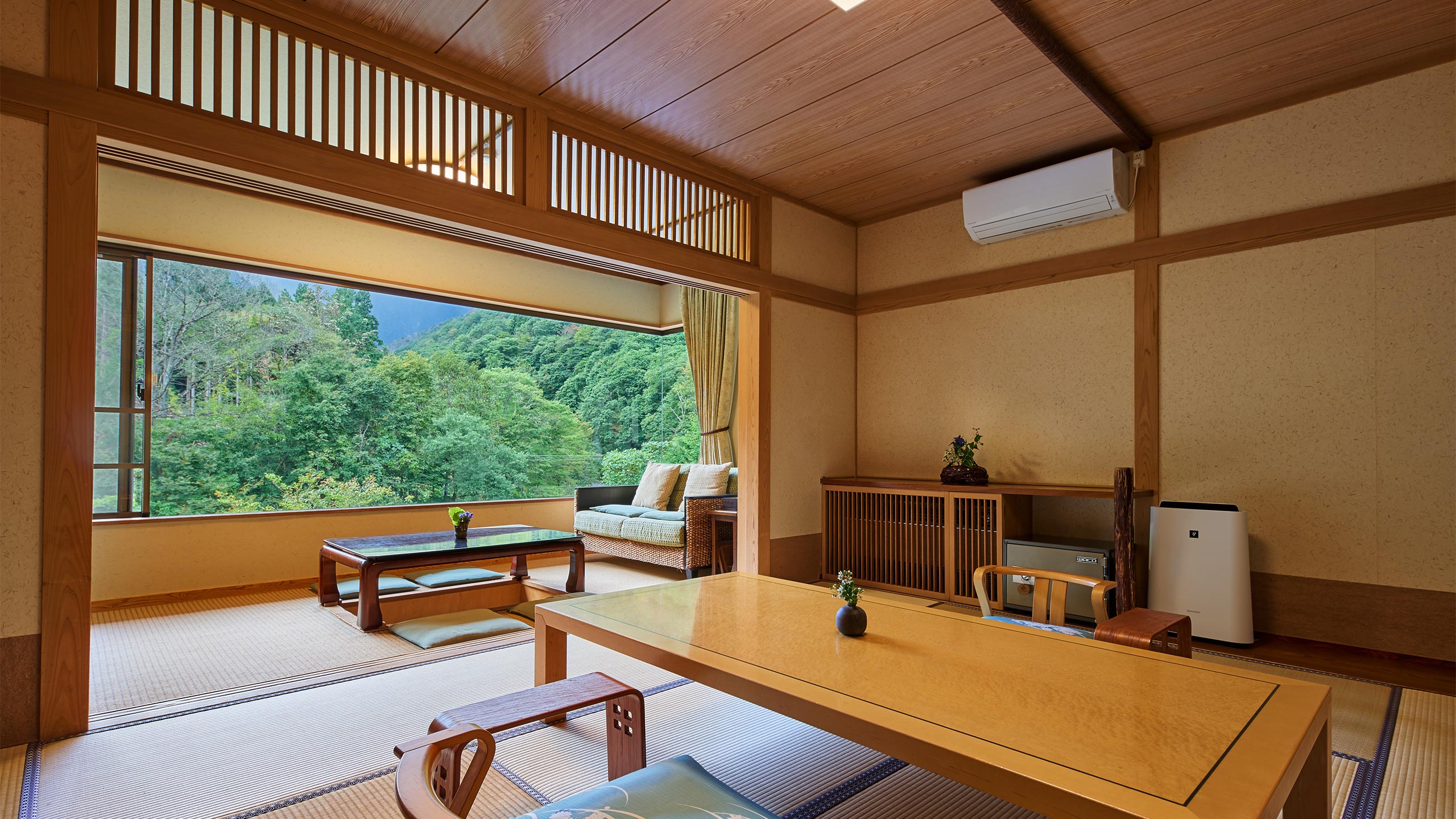 間取り 和室10畳 + 広縁4.5畳 + 半露天風呂 当館で最も人気の和室。窓の外には国立公園の雄大な景色が広がります。